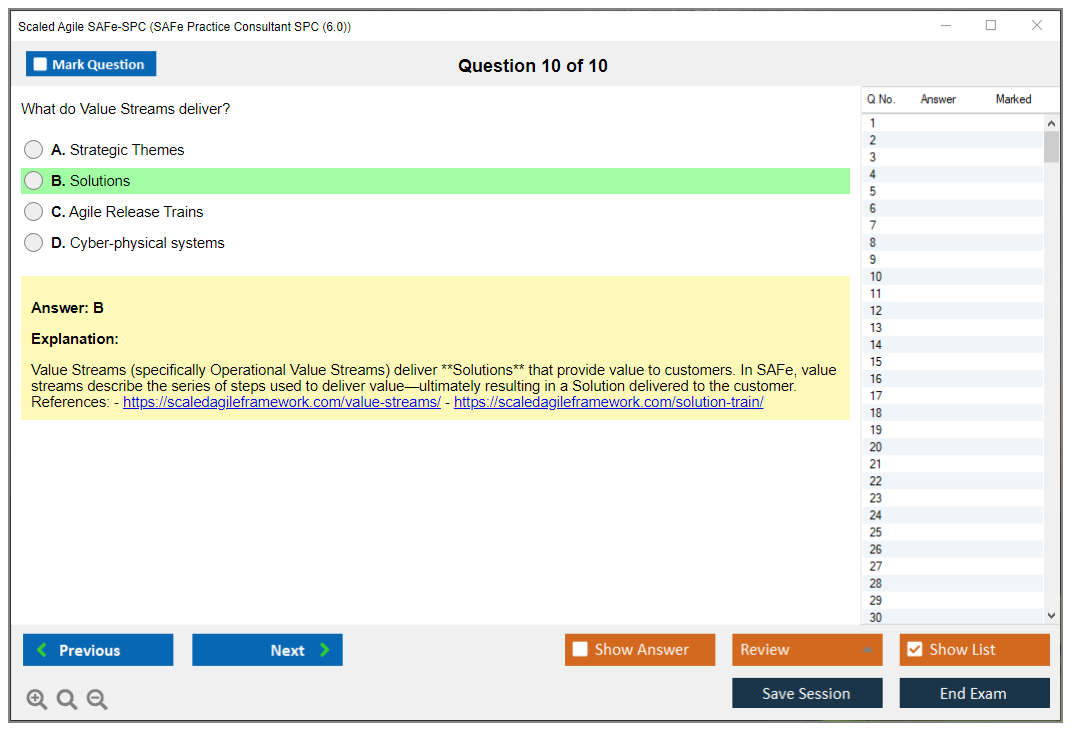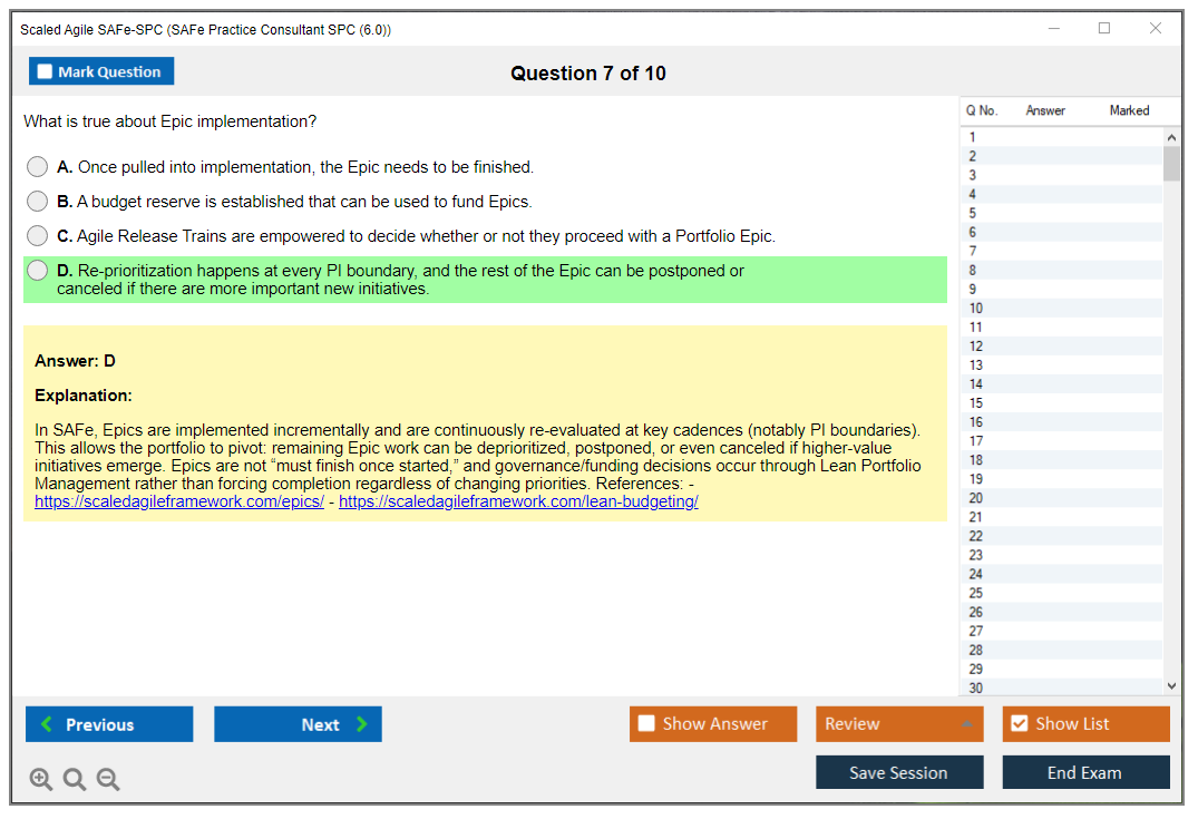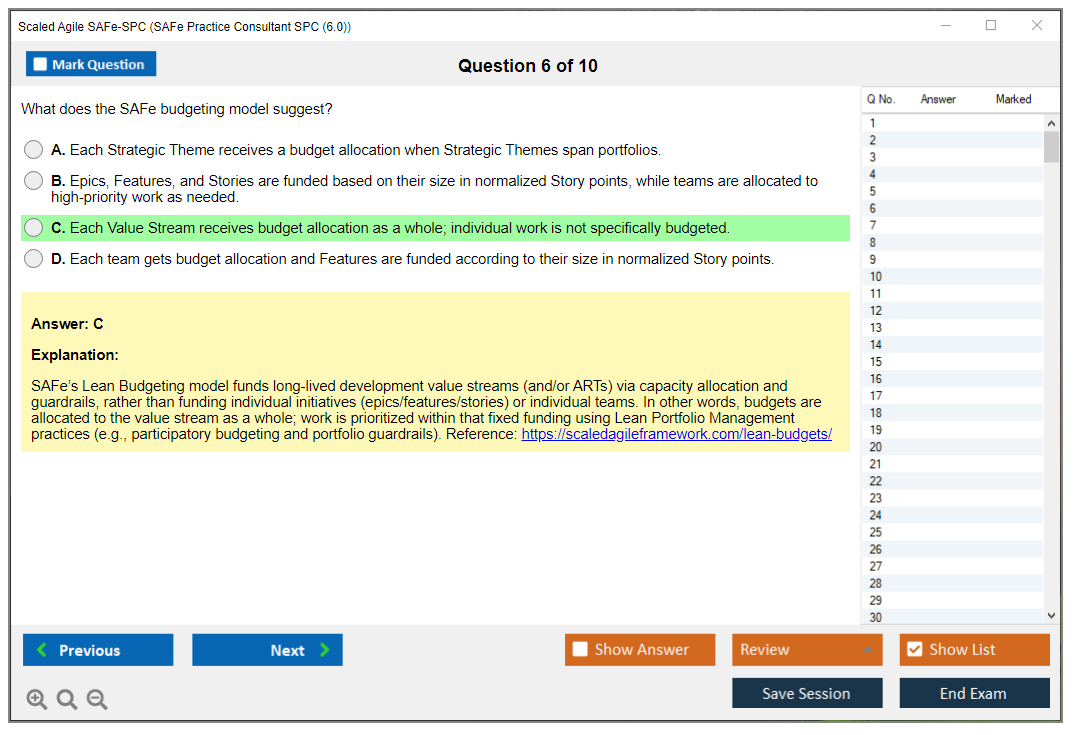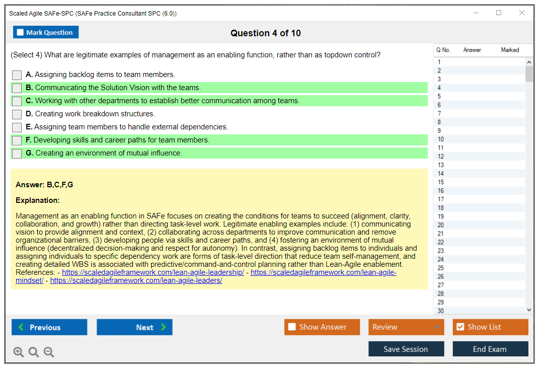 The Scaled Agile SAFe-SPC (SAFe Practice Consultant SPC (6.0)) exam is designed to validate knowledge and skills in implementing and coaching SAFe (Scaled Agile Framework) in an enterprise setting. It focuses on the principles and practices of SAFe, Lean, and Agile methodologies.